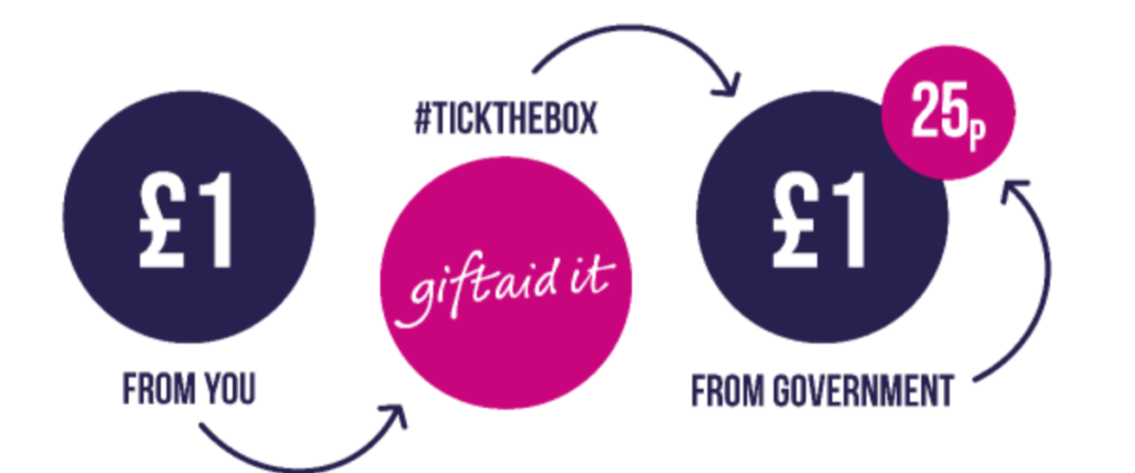 When you tick the Gift Aid box, the charity can claim an extra 25p for every £1 you donate, paid for by the government, not you.