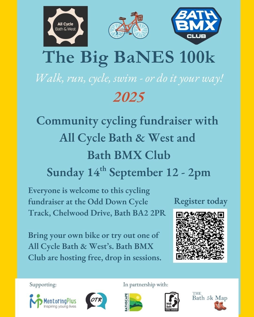 Hey Big BaNES 100k fundraisers! here's a great opportunity to clock up some extra kilometres and invite your family, friends and colleagues to a fun, inclusive cycle event this Sunday 14th September at Odd Down Cycle Track. It's free & traffic-free. Bring your own bike, or try one from All Cycle Bath & West and Bath BMX Club.