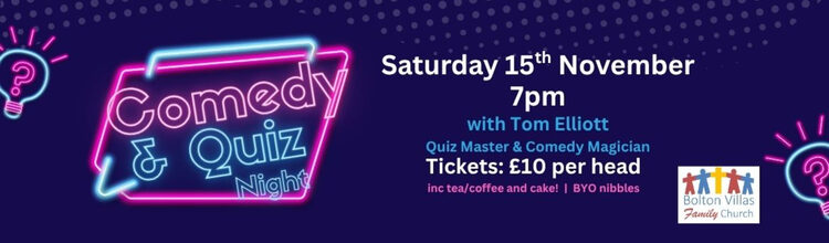 Come and join us at our Comedy and Quiz Night, to be held on Saturday 25th November 2025, with Tom Elliott, Quiz Master and Comedy Magician. Tickets cost £10 per head and include tea/coffee and cake, but do bring your own nibbles!