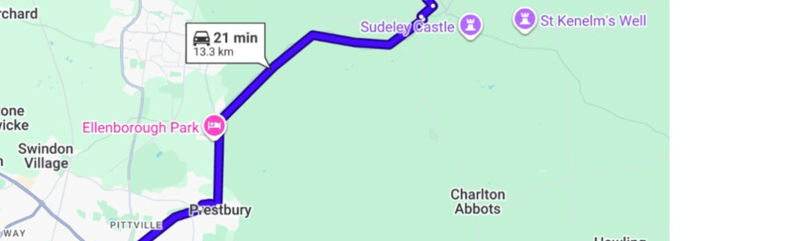 Walking from Sudeley Castle To Cheltenham Sat 30th May Includes Walking the hills peaks and troughs from Winchcombe to Belas Knap, to Cleeve Common, to The Rising Sun for a pit stop or lunch ??, Down hill all the Way to Kohler Mira The End.