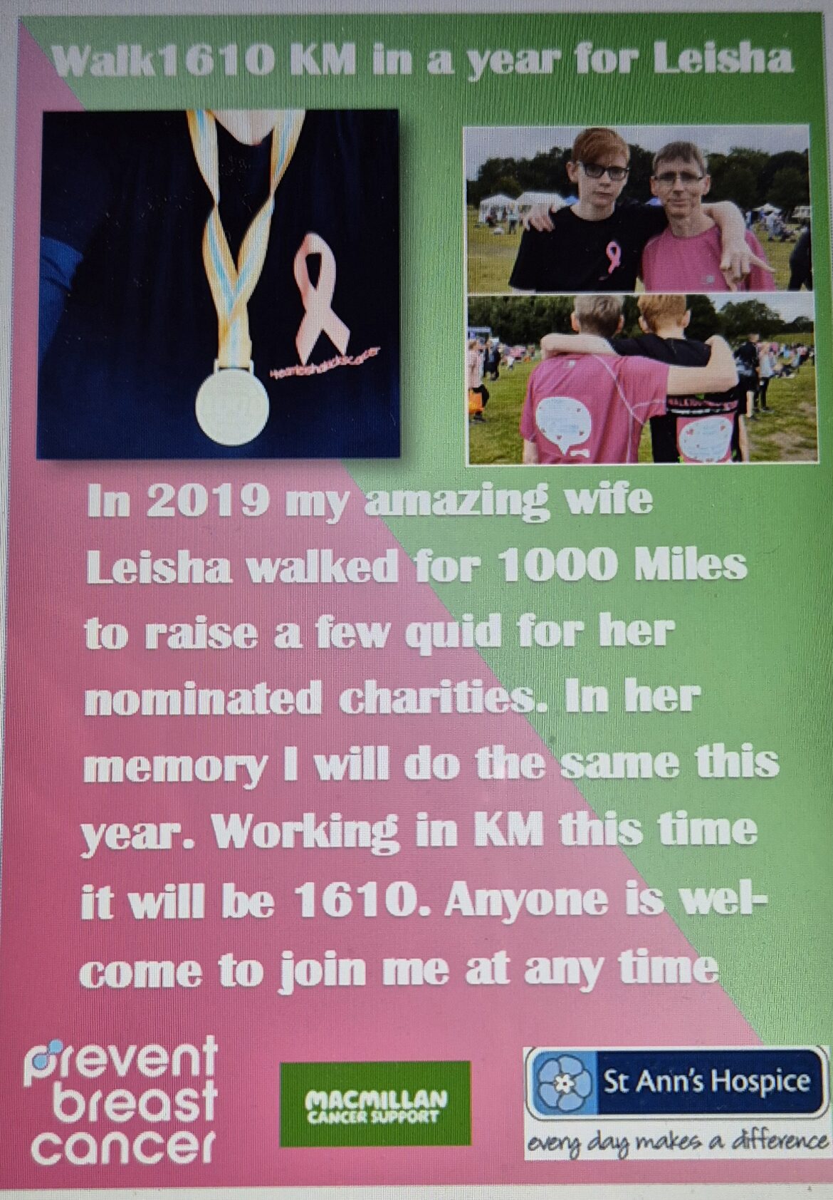 Sadly Leisha lost her brave and lengthy battle on 19th June 2025. We will continue to raise money in her name for her named charities. Thank you for all of your previous and ongoing support in raising money for these vital causes. Above all, she would want that. Thanks Mike